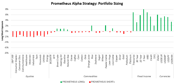 Equities and bonds are again moving in offsetting directions, creating a harder environment for shorts. Tactical shorting remains key to risk management. Nonetheless, our systems continue to hold equity shorts as the economic environment warrants these exposures. We show our Alpha Strategy positioning below: