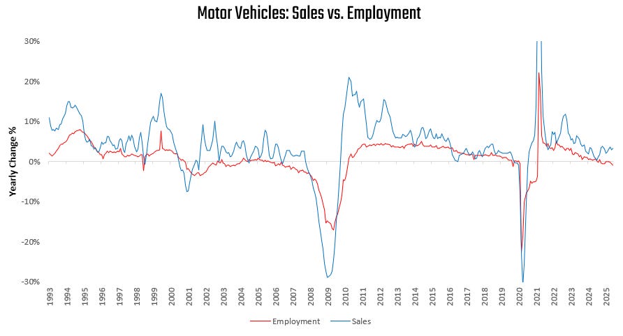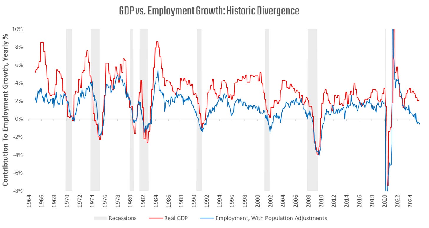 GDP growth remains near 2%, even as job creation slows. Immigration shifts are weighing on the labor force, not the business cycle. For now, spending continues to outpace labor growth — a sign of resilience, not yet a turning point.