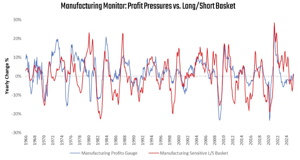 These wage conditions are not indicative of a recession, but rather of a nascent recovery. Manufacturing profits and new orders are recovering, while surveys have improved toward a neutral position. Capacity utilization remains subdued, but the direction of change is positive — early evidence that industrial activity is stabilizing. Our timely manufacturing gauges are showing nascent signs of a recovery: