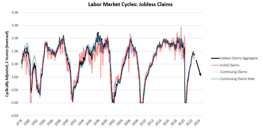 ii. Labor markets remain tight, allowing the Fed to continue tightening. The labor market is the marginal driver of economic activity today, with labor market strength passing through to both real incomes and inflation. Therefore, we are likely to see the deterioration in both real incomes and inflation come alongside the marginal weakening of the labor market. However, recent data suggest we are a ways off from this. Initial Claims disappointed expectations at 222 versus the expected 235 while Continuing Claims surprised expectations at 1473 versus the expected 1438. Below, we show the history of these measures, along with the Continuing Claims Rate, after adjusting these measures to provide an appropriate comparison & to showcase their trajectory over the economic cycle. Additionally, we combine these measures into a Jobless Claims Aggregate to capture the broad trend in the data: