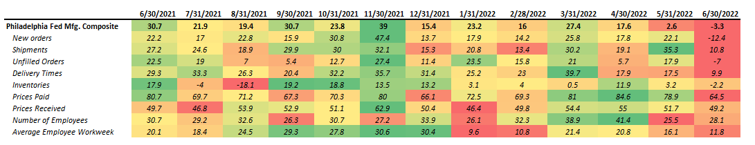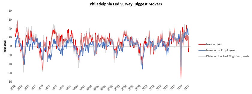 ii. PMI data continues to confirm a slowdown in economic activity. The latest Philadelphia Fed manufacturing survey data showed a contractionary reading of -3.3, implying 1% YoY earnings for the S&P 500. This reading was a sequential deceleration within a decelerating trend. The largest gaining segment was the number of employees, and the most significant slowdown was in new orders. We show this below: