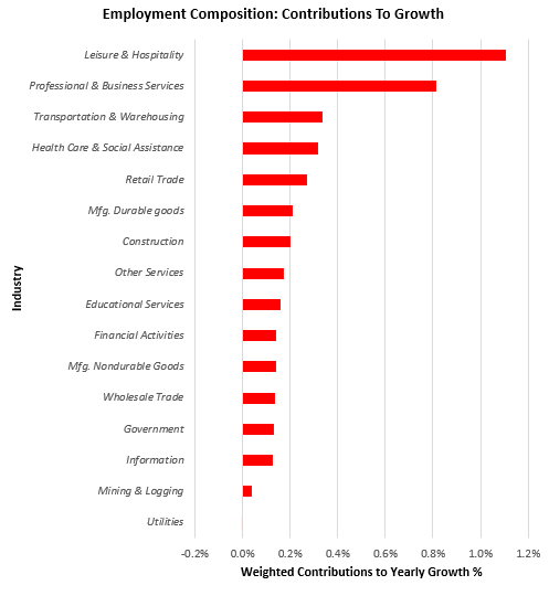 Massachusetts showed the most significant increase in weekly unemployment claims, while New York led the most significant decrease. Unemployment is broadly below trend on a secular basis; however, based on trend developing in profitability, income, and inflation, we think this potentiates future unemployment. In particular, we would expect a weakening in industries leading the charge in employment growth to catalyze the next leg lower in employment as discretionary spending drags as growth slows further: