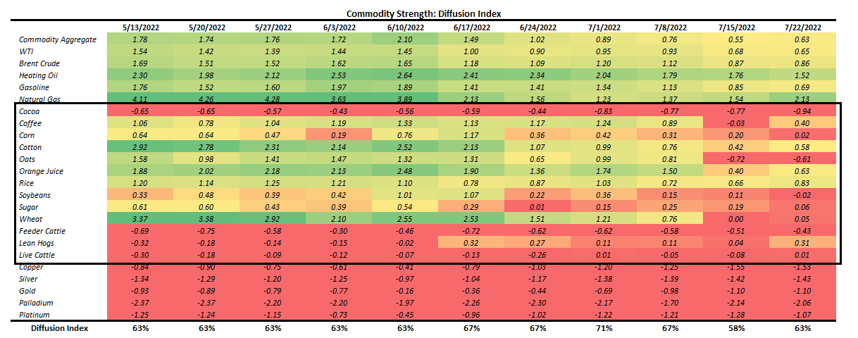 Transportation, food, and energy costs are now moving into a part of the cycle where considerable headwinds are developing. Motor vehicles and related expenditures are exposed to a cyclical slowing in consumer spending. At the same time, food and energy cost increases are likely to slow as the commodity complex shows weaker diffusion indices. We offer the weakening of the commodity complex below and highlight the declines in food & agricultural products: