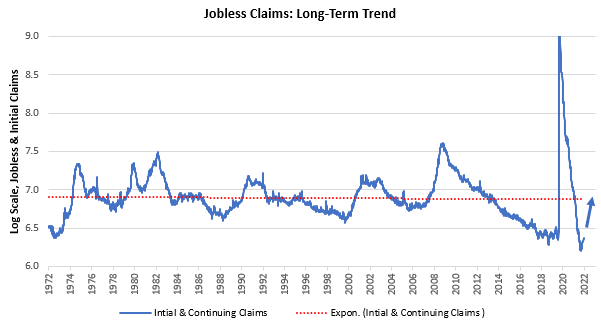 Relevant to developments in the labor markets, we saw a further uptick in initial jobless claims. Initial claims tend to be the first mover in the labor market complex to signal economic turning points: