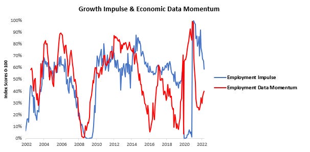 Stepping back, we see these trends emerging in economic data momentum (our measure of whether data is surprising or disappointing on a cyclical basis) and employment impulse data. We show these below:
