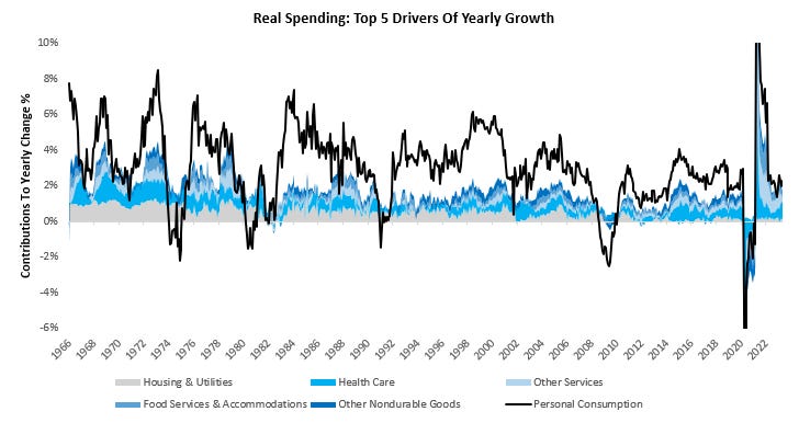 We zoom out to show the drivers of current trends in spending. Over the last year, Other Nondurable Goods (0.63%), Housing & Utilities (1.49%), Health Care (1.39%), Food Services & Accommodations (0.65%), & Other Services (0.88%). have been the primary drivers of the 6.73% growth in spending. We show the contributions of these items to yearly changes in total spending below.
