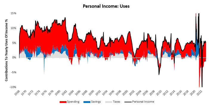 This nominal spending of nominal income continues a trend that has been in place since last year, i.e., one of declining sustained savings reductions: