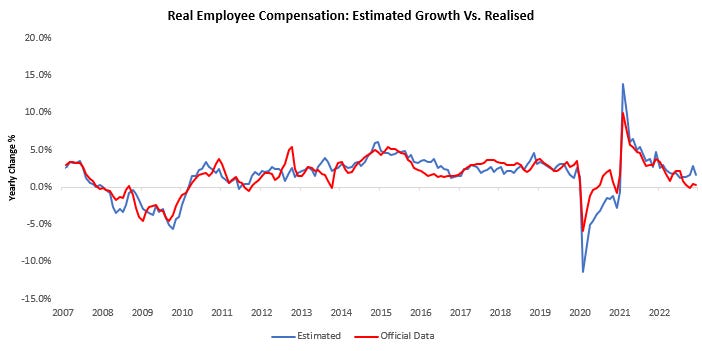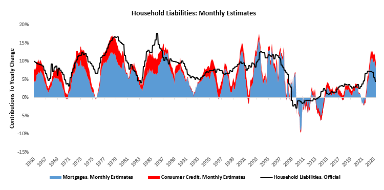 Contemporaneously, household liabilities have grown by 9.73%, driven by a 7.99% rise in mortgages and a 1.73% increase in consumer credit. We show our estimates for both below, along with the official data:
