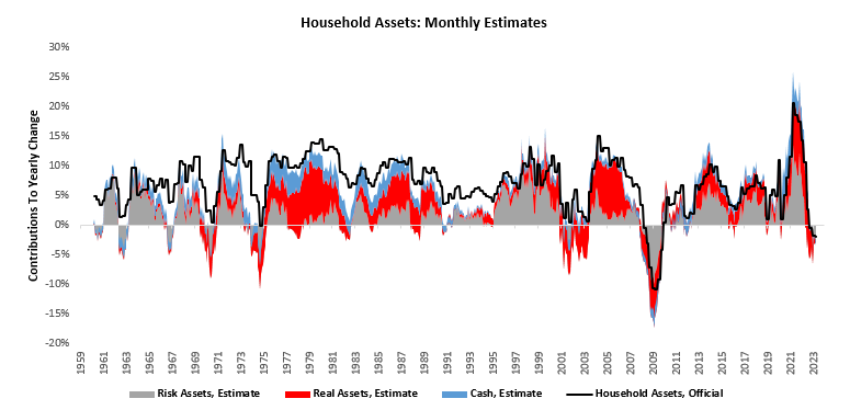 Over the last year, household assets have fallen by -0.97%. Below, we decompose these changes in assets into risk assets (equities, corporate credit, etc.), real assets (real estate, consumer durables, etc.), and cash assets (checking, savings, money markets funds, etc.). Risk assets, real assets, and cash assets have contributed 0.29%, -0.36%, and-0.9%, respectively, to the total change in household assets over the last year: