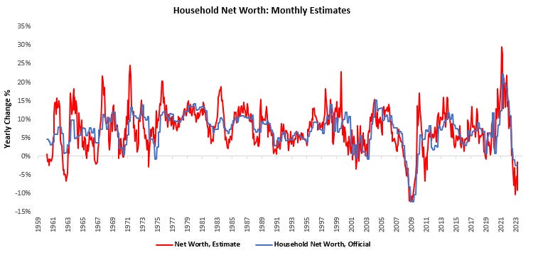 While savings decreased, household net worth increased. According to our latest estimates for the month of April, household net worth increased by 2.9%, driven by a 2.81% and -0.08% change in assets & liabilities, respectively. We show the evolution of our household net worth estimates below, which show that net worth has contracted -0.97% over the last year: