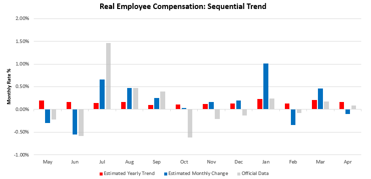 As we can see above, professional and business services continue to be the bastion of the current resilience of the consumer economy. On the other end of the spectrum, financial activities continue to see weakness, especially ex-inflation. It is important to recognize that real incomes this month were weak. Our estimates indicated a -0.10% contraction; official data came up 0.10%. We show the sequential evolution of the data below: