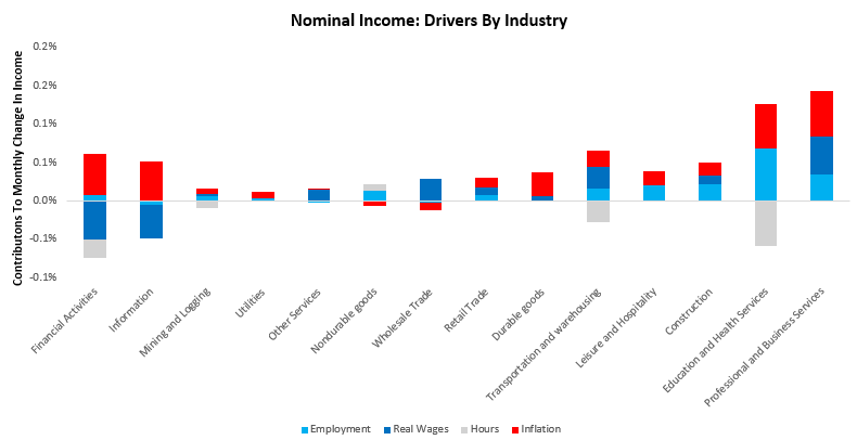We zoom into employee compensation to show the industry-wise breakdown of this increase in income. Further, we break these gains down into their macroeconomic drivers, i.e., employment, real wages, hours worked, and inflation. We show these ranked from lowest (left) to highest (right):