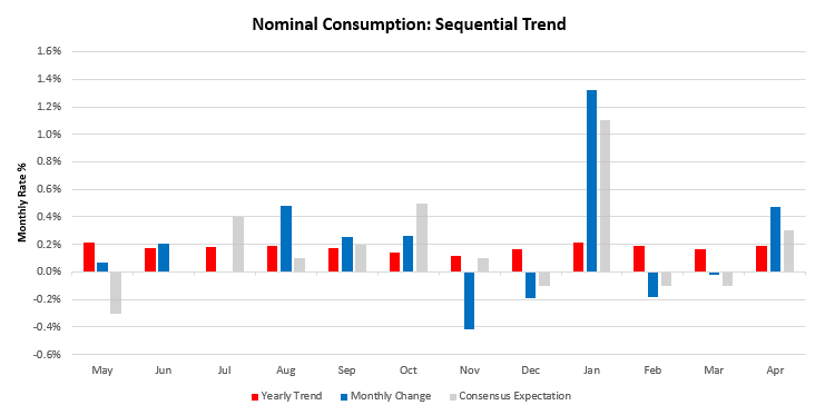 These income gains translate into spending gains. Nominal consumer spending increased 0.84% in April, surprising consensus expectations of 0.3%. This print contributed to a sequential deceleration in the quarterly trend relative to the yearly trend. Below, we show the monthly evolution of the data relative to its 12-monthly trend and consensus expectations: