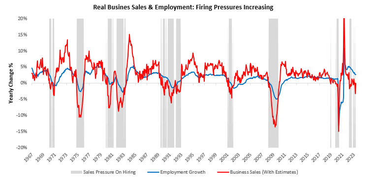 This decline in nominal sales will likely cause a further deterioration in inventory growth, which will flow through to GDP in the form of a further inventory drawdown. Additionally, real sales growth is currently below employment growth, suggesting downward pressures on future hiring. The divergence between sales & hiring is significant relative to history, suggesting strong downward pressure on future employment: