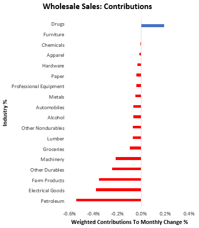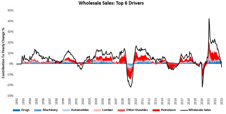 Of these categories, wholesale sales remain the weakest link. As mentioned, wholesale sales weakened significantly in March (-2%), and the weakness remained broad-based. We show the major drivers of this change below:
