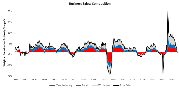 Specifically, we received new data in the form of wholesalers’ sales & revisions to their inventory numbers. The latest wholesale sales data disappointed expectations, with a monthly change of -2.1% versus the expected 0.4%. This data resulted in a -1.5% decrease in total nonfarm sales- with manufacturing, retail, and wholesale contributing -0.03%, -0.26%, and-0.77%, respectively. We show their relative contributions to sales activity over the last year: