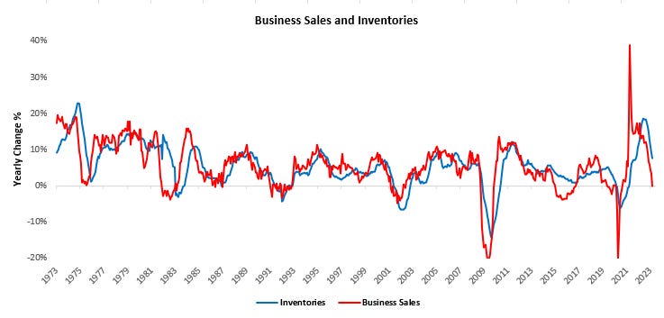 The latest data shows us that nominal business sales continued to slow down through March, now at 0% growth versus last year. Inventory growth continues to follow sales growth lower, as inventories are managed based on sales: