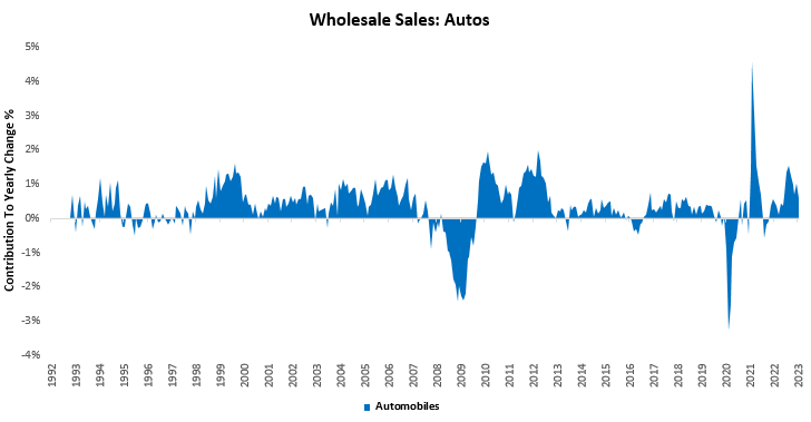 As we can see, wholesale sales of petroleum, durables, and lumber continue to weigh on business sales. Part of this decline is likely due to price declines in these segments. On the other hand, areas like automobiles continue to show strength. We zoom in on automobiles as it has typically more sensitive to changing credit conditions. We currently see little weakness in the yearly trend in wholesalers’ sales of automobiles: