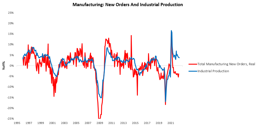 Over the last year, Durable Goods New Orders have been in a downtrend, and the latest values confirm this trend. As we can see above, durable goods orders remain healthy on a nominal basis- however, the picture is dramatically different when we adjust these numbers for inflation. New orders for durable goods are negative on a real basis, i.e., the volume of goods ordered is now declining. Furthermore, these values are at odds with industrial production, i.e., production continues to outpace new orders. We show this below: