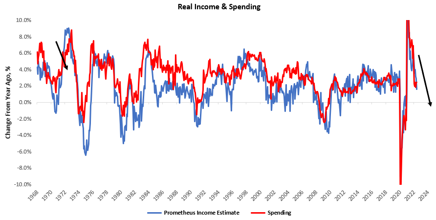 This mismatch between new orders and production is driven by the fact that consumer demand continues to deteriorate on a real basis as real incomes weaken. Below, we show how income & spending continue to weaken:
