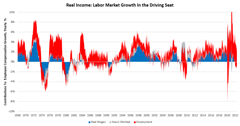 This dynamic is particularly important in today’s context, as labor force growth is the primary driver of income growth in the economy. Labor force growth accounts for more than 100% of real income growth today, as wages rates and hours worked have moved into contractionary territory. Recall income growth can come from higher wages, more hours worked, or more employment. Currently, all income gains are coming from increasing employment. We show the relative contributions below: