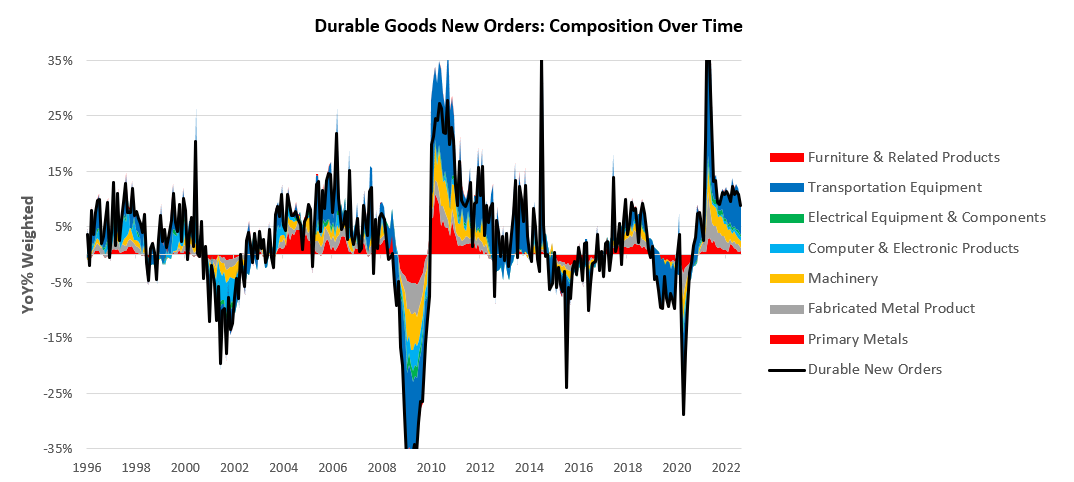 Today, we received data on the new orders for manufacturing durable goods. This information helps assess the underlying demand for manufactured items and is indicative of business demand rather than final demand, as manufacturers typically sell to other businesses rather than directly to the consumer. Resultantly, trends in new orders tend to reflect the outlook of companies, which are essentially a function of their current performance. Below, we show the most recent data for the new orders of durable goods: