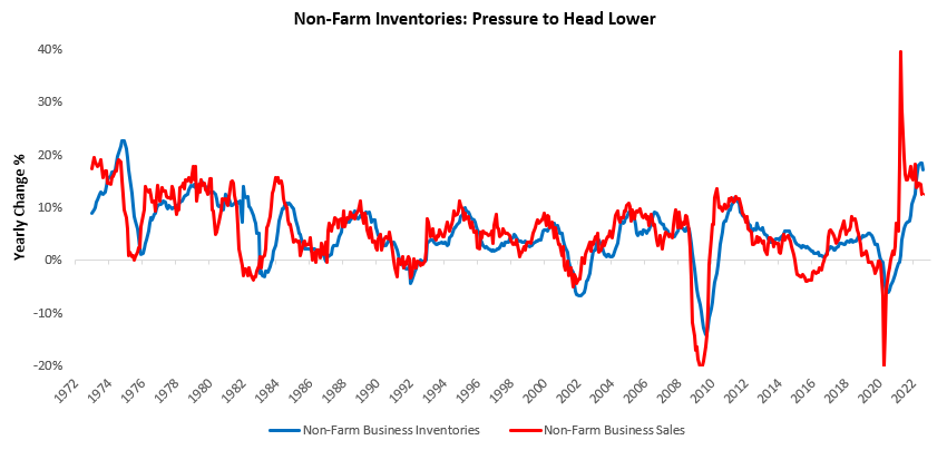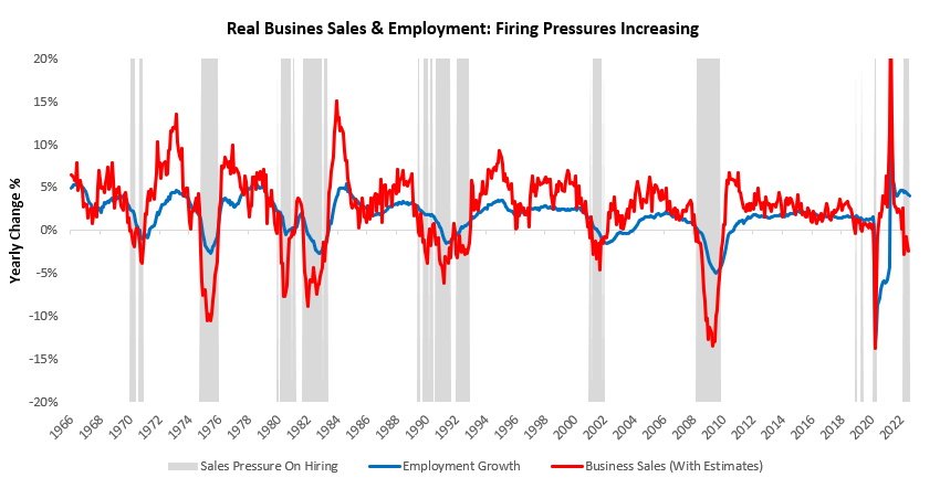 However, inventory build without adequate sales growth is an unsustainable dynamic; eventually, inventory growth will likely fall prey to weak sales. Resultantly, production will come under pressure as both final and intermediate demand dries up. Lowe output results in a lower need for workers- catalyzing layoffs. These moves are consistent with history— since 1966, there have been eight periods where there has been a mismatch between sales & employment like today, and all of them have resolved themselves in labor force contractions.