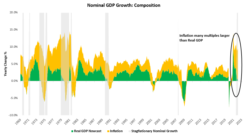 We are clearly in the tightest labor market on record. The combination of these factors creates a situation where there is a high and increasing likelihood that real economic activity will move towards contraction. However, nominal spending can still stay positive during this period. Nominal spending has inertia, i.e., nominal spending in one period tends to resemble nominal spending in the next. With a highly elevated level of nominal spending like today, it is doubtful that we will move into a period of contractionary nominal spending in the near term. Therefore, even if we see a decline in nominal spending over the next few months, it is unlikely to be as pronounced as the decline in real output due to the large difference in starting points. We show the composition of nominal spending below: