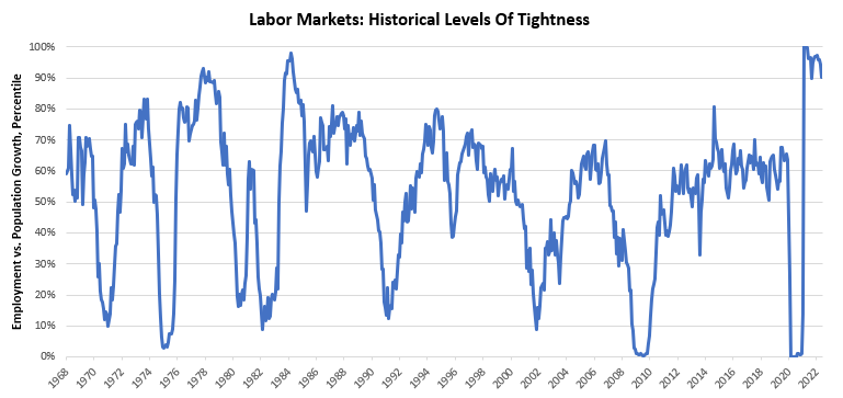 However, there are limits to how much we can increase employment (even with Fed tightening aside). We are in a historically tight labor market, i.e., there’s not much room to add more employment. Below, we show the current growth of the labor market adjusted by the population growth rate to show how extended the labor market is relative to the existing population.