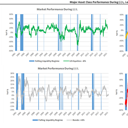 Markets: After a volatile week, US equities managed to close the week in the green, and commodities continued their dominant run, continuing their streak as the best performing asset year-to-date. There has been a considerable divergence internally within these pro-growth asset aggregates, creating opportunities for our systems to exploit. Resultantly, our systems have triggered signals both long commodities and short equities, which offers us a solid risk-reducing pairing. We also showcase our upgraded Market Implied Regime Monitor, which includes a liquidity dimension. Consequently, we highlight the looming threat of a (-) L regime, i.e., tightening liquidity. We explain more on page 3. To summarize our systems’ current assessment: Our upgraded Market Regime Monitors continue to confirm the dominance of (+) G (+) I; however, we also see that the probability of (-) L has risen significantly. (-) L environments tend to be challenging for growth assets. Equities (-6%), commodities (-18%),and gold (-16%) all fall during (-) L on an annualized basis. The degree of this pricing is significant, and we could see a shift within the next week from (+) G (+) I to (-) L reasonably quickly. Consequently, our expected return and risk analysis tell us that the best opportunities are Long: Bonds, Cotton, Lean Hogs, Cattle, Sugar, and Short: Communications. However, our Risk Management Monitors indicate that we can ADD to LONG: Sugar and SHORT: Communications. We can REDUCE our LONG: Cotton, Lean Hogs, and Cattle. Our Expected Return Strategy has exited these positions and is now LONG: Sugar & SHORT: Communications.