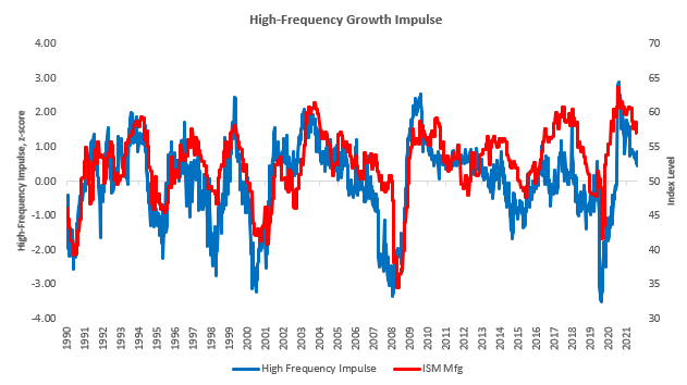 Consistent with market pricing, our High-Frequency Growth Impulse measure continues to trend lower. This backdrop looks increasingly poor for the next ISM manufacturing report: