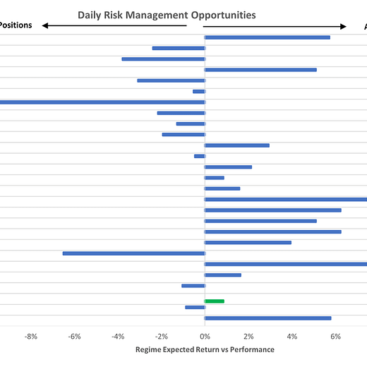 Markets: After a torrid day of trading, US equities closed in the green on aggregate, while our sole position, US bonds, closed in the red. These moves came on the back of significant changes in volume, suggesting technical factors (portfolio rebalancing, de-grossing, etc.) played a prominent role. We designed our systems to capture the underlying market trend, and despite their strength, these moves were too short of having any material change to the market regime. Therefore, going into today, the set-up is similar to yesterday, in that Treasuries offer attractive return-on-risk characteristics for the given regime, alongside a solid trading set-up. Additionally, our systems continue to look for opportunities in select commodities to add exposure. To summarize our systems’ current assessment: Our Market Regime Signal has decidedly moved towards pricing (+) G (+) I, i.e., rising growth and inflation, market regime. Furthermore, (-) G (+) I continue to exhibit momentum on a one-month basis, now vying for dominant status over this period. Consequently, our expected return and risk analysis tell us that the best opportunities are Long: Bonds, Cotton, Lean Hogs, Cattle, Sugar, and Short: Communications. After our Market Regime Signal transition to (+) G (+) I after pricing in (+) G (-) I, the menu of options from a return-on-risk perspective has gotten significantly wider. However, our Risk Management Monitors indicate that we can ADD to LONG: Bonds and Cattle. While our daily signal tells us Cattle is a solid opportunity, our expected return strategy will wait for further confirmation to introduce this position to its allocation.