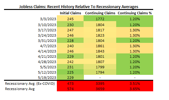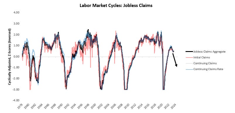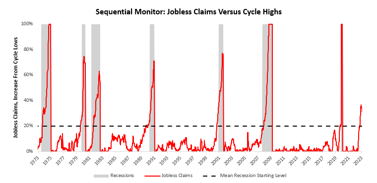 Today, we received new information in the form of jobless claims data. Jobless claims continue to show secular strength and cyclical slowing. However, they also so significant sequential softening from the cycle peak. These values do not indicate that we are currently experiencing a recession; however, looking backward, there is a significant change that we are in the ballpark of the recession start date if claims begin to weaken considerably.