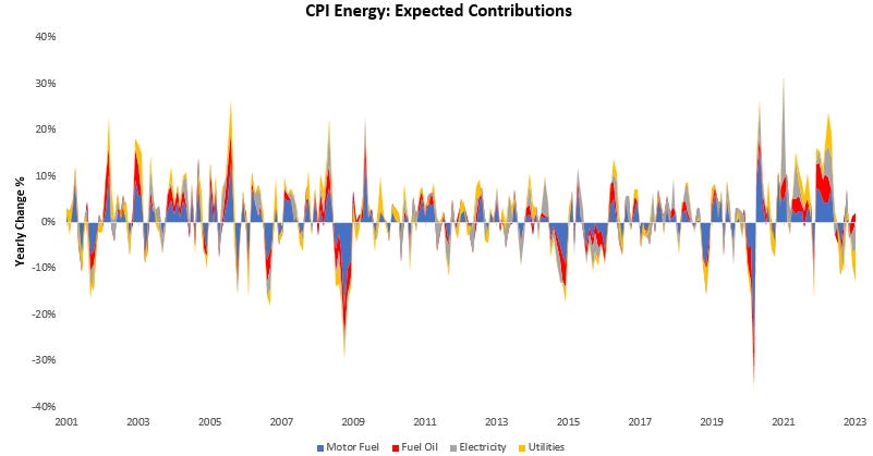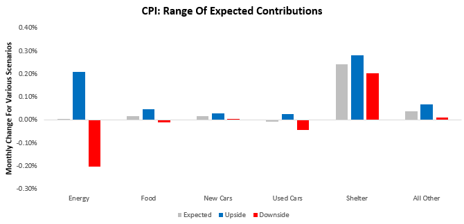 However, we think it is essential to recognize that this is a slow-moving cyclical force, and it is hard to time this pass through with a high degree of accuracy in monthly prints. Nonetheless, we must keep in mind this is a significant headwind for inflation and that odds increasingly favor disinflationary forces from this as months carry on. Below, we show our range of expected contributions to headline CPI broken into 6 categories that we believe to be dominant drivers at this junction: energy, food, new & used vehicles, shelter, ad all other components. We the range of our expectations on the upside and downside.