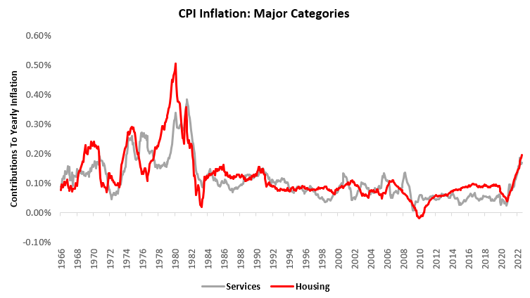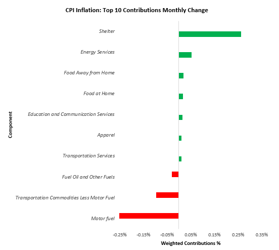 Over the last year, Food at Home (1%), Food Away from Home (0.43%), Energy Services (0.55%), Shelter (2.46%), & Transportation Services (0.88%). have been the primary drivers of the 6.42% CPI inflation. We show the contributions of these items to yearly changes in total spending below: