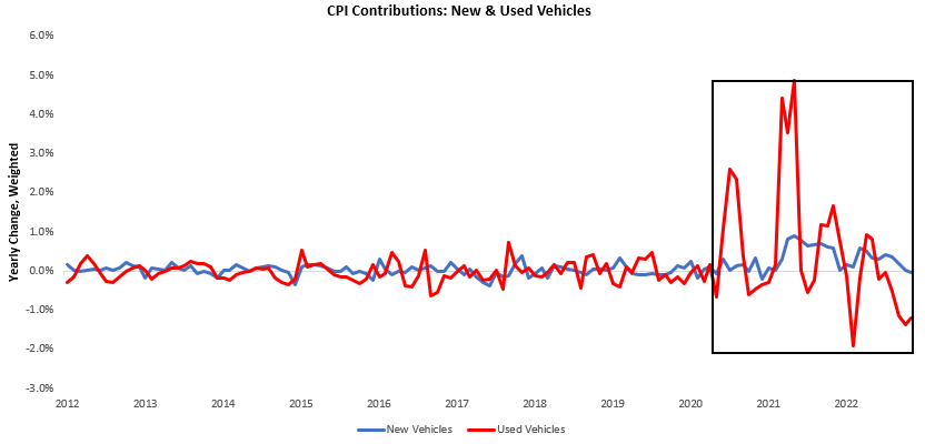 Within this category, used cars continue to be the primary driver of declines; however, new cars have also now slipped into deflation. We show this below: