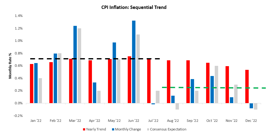 CPI inflation came in line with consensus expectations but counter to our forecasts. CPI Inflation decreased -0.08% in December. This print contributed to a sequential deceleration in the quarterly trend relative to the yearly trend. Below, we show the monthly evolution of the data relative to its 12-monthly trend and consensus expectations: