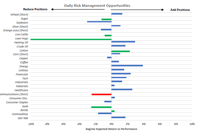 To summarize our systems' current assessment: Our Market Regime Monitors show that we have started the week once again in (+) G (+) I; however, the odds of (-) G (+) I have accelerated significantly. Our Momentum Monitors continue to show elevated momentum in Commodities and Gold, while Equities and Treasuries continue to flounder. This dynamic suggests sustained momentum in the market pricing of inflation. Therefore, while our Market Regime Signal points to (+) G (+) I, persistent inflation and slowing real growth have led our systems to flag Gold as a new optimal exposure. Consequently, our systems tell us that the best opportunities are Long: Bonds, Gold, Cotton, Lean Hogs, Live Cattle & Sugar, and Short: Communications. However, our Risk Management Monitors indicate that we can ADD to LONG: Bonds & Cotton. We can REDUCE our LONG: Gold, Lean Hogs, Live Cattle & Sugar, and SHORT: Communications. Our Expected Return Strategy is LONG: Cotton & Sugar.