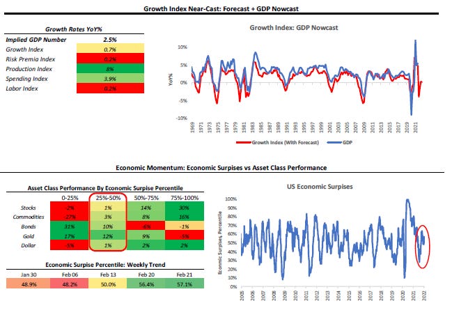 To summarize our systems' current assessment: Our GDP Nowcast and Economic Momentum measures have diverged over the last week, with our GDP Nowcast roughly unchanged, but our Economic Momentum turned higher. This divergence is likely driven by a material repricing of growth expectations lower. However, our systematic forecasts for growth tell us that there is material deceleration ahead of us during the March-April period. Our Liquidity Monitor shows that Repo activity slowed in January, alongside flows into Money Market Funds. These suggest tightening private liquidity for financial markets.