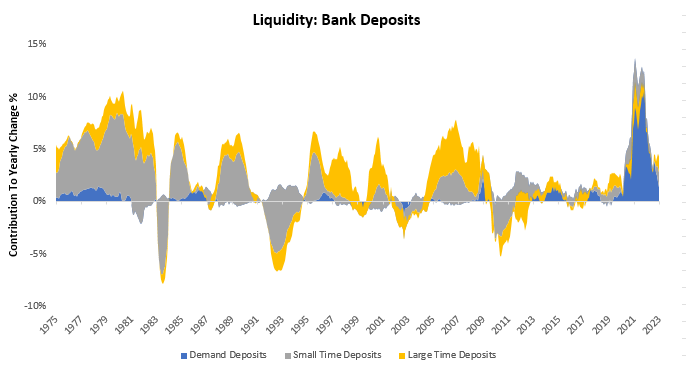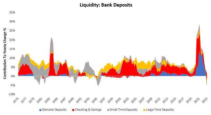 Therefore, while monetary aggregates have contracted, they have largely come as a function of the pullback in monetary and fiscal stimulus rather than the weakening of private sector lending. This tightening policy liquidity has contributed to a contraction in bank deposits, primarily in the form of declining checking and savings account balances. We show this below: