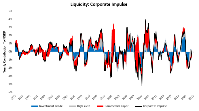 This increase in commercial paper issuance came alongside an increase in investment-grade issuance but an offsetting decrease in high-yield issuance. Below, we show the corporate impulse arising from these forces:
