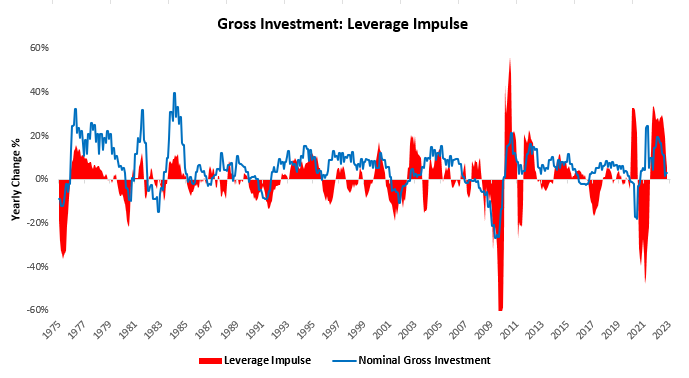 The combination of these factors is a drag on aggregate deposits within the banking system; however, they are not indicative of a tightening of procyclical lending and borrowing. In fact, our estimates show that the leverage impulse from private-sector borrowing remains net support for gross investment, even though gross investment continues to weaken: