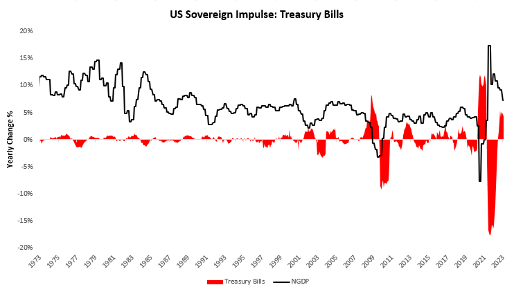 Alongside the impact of gross issuance, the composition of issuance becomes important to financial markets; the more short-dated the issuance, the less chance there is for private capital sector losses— i.e., the more short-date the issuance, the more liquidity inducing the gross issuance becomes. The Federal Reserve can significantly impact this composition of the US Sovereign liabilities through quantitative easing and tightening (QE & QT) programs. When the Federal Reserve engages in QE or QT, it embarks on maturity transformation, i.e., it changes the composition of the US Sovereign, making it more or less liquid as it purchases Treasury securities and gives the financial systems liquid reserve assets. Below, we net out these impacts to show the aggregate policy impulse from the US Sovereign: