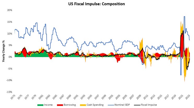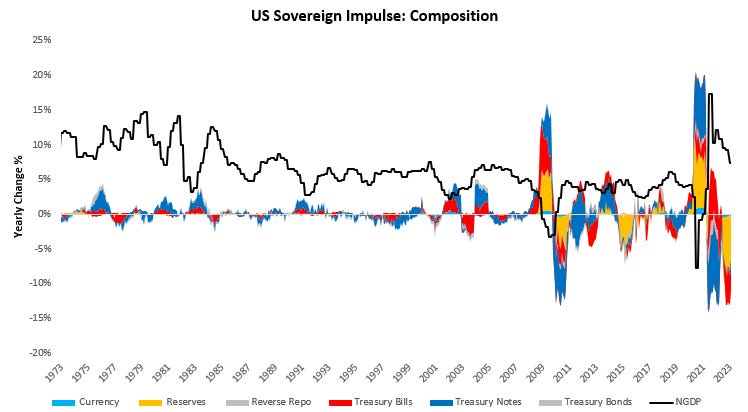 The Federal Reserve controls interest rates across the economy by setting policy rates, with all other interest rates pricing risk relative to policy rates, while the Treasury control issuance of Federal securities. We call the combination of these entities the US Sovereign, whose liabilities are the assets of the private sector. The US Sovereign is the issuer of the currency, and thus its ability to meet interest payments is rarely in question, making its liabilities the highest quality liquid asset for any given duration. The purpose of government borrowing is to offer a store hold of wealth while redistributing excess private income in the economy to achieve some measure of societal good. This spending from borrowing, alongside spending from income, creates the fiscal impulse, which is additive to GDP. Below, we show the fiscal impulse and its contributions to GDP: