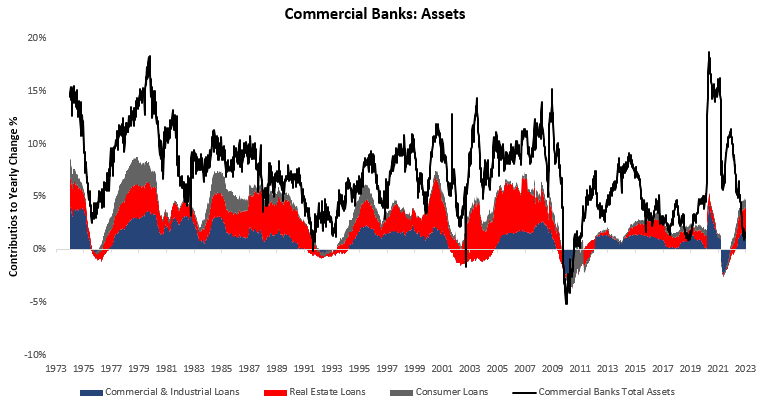 Alongside this amelioration in the declines in the policy impulse, we have seen significant liquidity creation by private sector entities over the recent past. Mainly, we have seen commercial bank increasing their credit exposure to the real economy. Particularly, banks have procyclically increased their exposure to commercial loans, real estate loans, and consumer credit. We show this below: