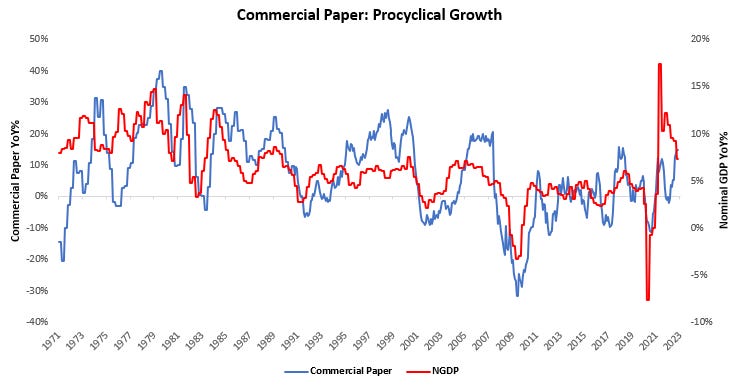 We see further evidence of this strength in procyclical liquidity in corporate borrowing markets. Much like the financial sector and government, the corporate sector is also a liquidity creator, though they rank lower on the hierarchy. Much like bank credit, we have seen corporate credit issuance expand. Particularly, we have seen an expansion in commercial paper activity, which is in line with the elevated levels of nominal business activity we saw last year. Below, we show the growth of commercial paper, along with nominal GDP, to emphasize the procyclical nature of commercial paper issuance: