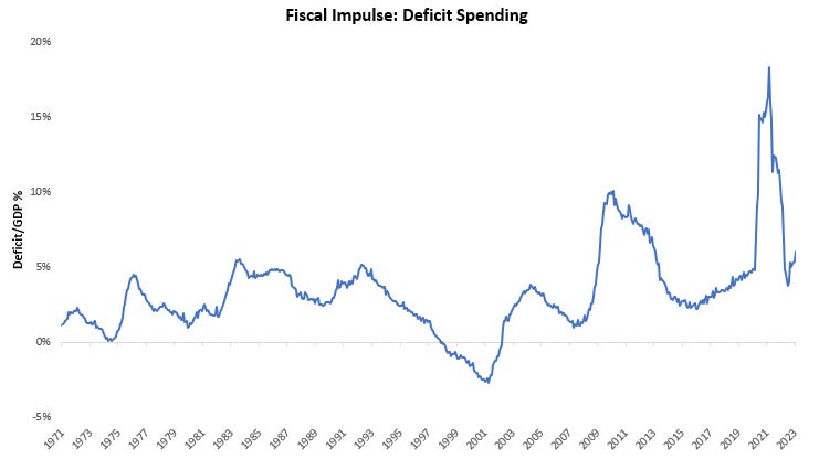 The first-order impact of policy liquidity creation is that it uses savings to create spending, which generates income. Additionally, the private sector absorbs a high-quality asset, which also generates interest. These two impacts are simply a function of issuance, income, and spending. In today’s setting, the fiscal impulse has improved marginally, though it remains a drag on economic activity. This translates into a modest uptick in government deficit spending: