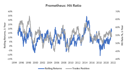 Last week, our Alpha Strategy suffered losses as market moves turned against Commodity & Equity exposures. These losses were somewhat offset by gains in FX exposures, i.e., long USDMXN. Our Hit Ratios on a rolling one-year basis remained at 54%, but down from the peak earlier this year at 57%: