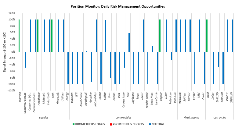 The Prometheus Alpha Strategy is LONG: S&P 500, Healthcare, Tech, Copper, Gold. Our Beta Rotation Strategy is currently LONG: Commodities. A Market Regime Portfolio would be allocated to Stocks & Credit: 4%, Commodities: 57.4%, Treasuries & IG Debt: 0%, Gold & TIPS: 5.3%, Cash: 33.5%.