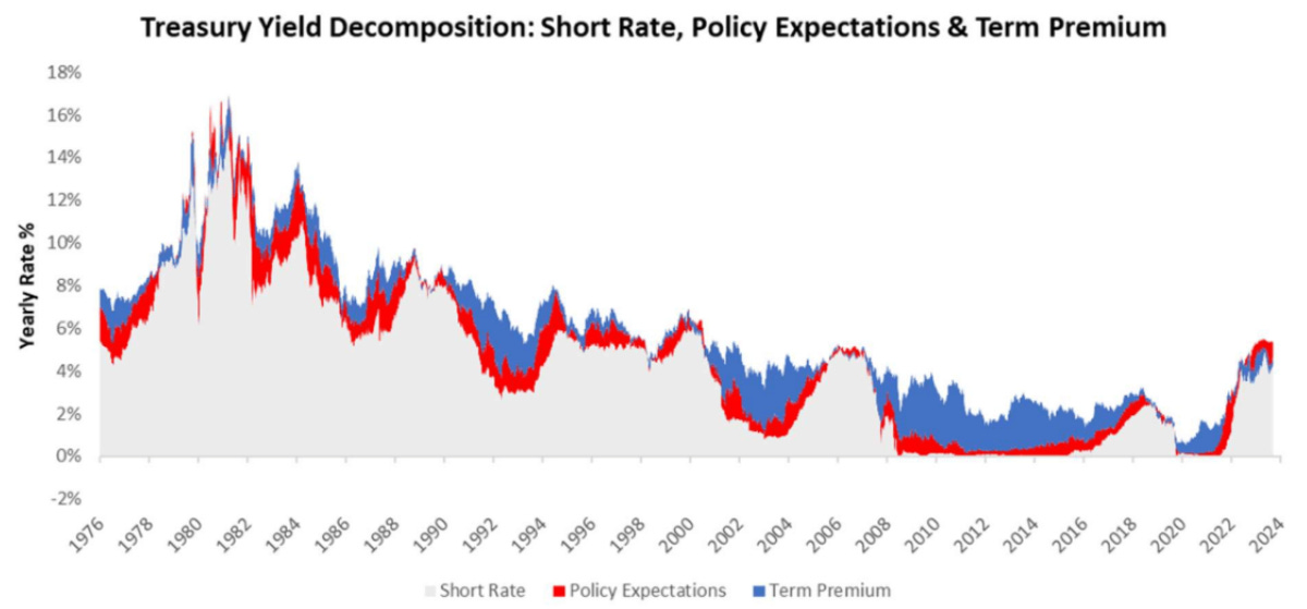 Beyond policy rate expectations, we have Term premia. Term premia reflect the added risk of investing in long-term security rather than simply rolling a series of short-term securities over the same period. As such, term premia exists for every maturity of treasuries but progressively expands the further we go out in maturity, i.e., a 10-year note contains a larger term premium than a 2-year note (which has almost none). This term premium is a function of the player’s demand and supply forces in the long-term treasury market and reflects longer-term nominal growth dynamics.